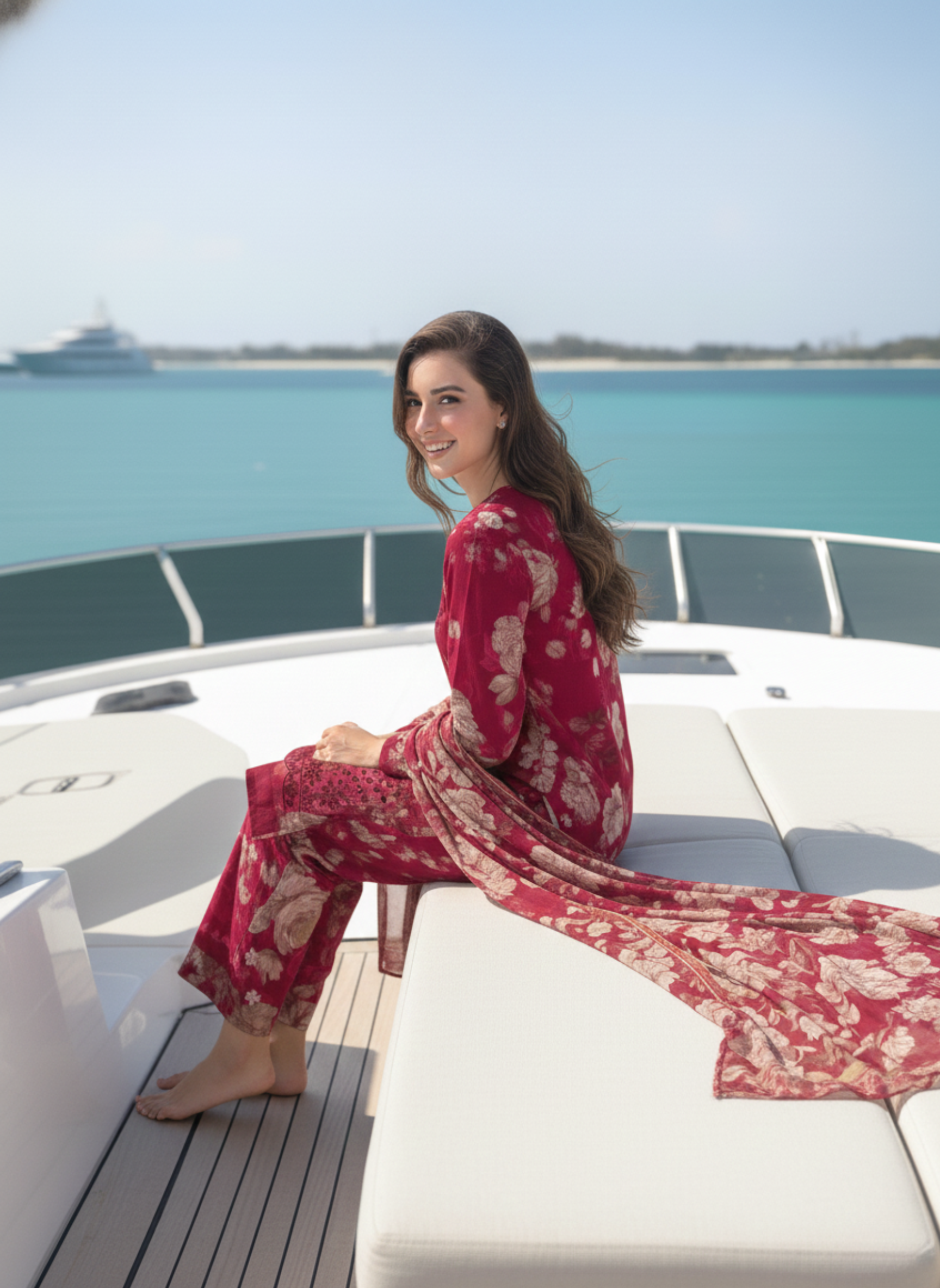 Completing the look is a lightweight printed lawn dupatta, designed with flowing beige floral patterns that drape effortlessly and add softness to the overall appearance. Its airy texture and wide fall bring a feminine, graceful charm — perfect for elegant daytime styling, festive gatherings, or refined casual wear.