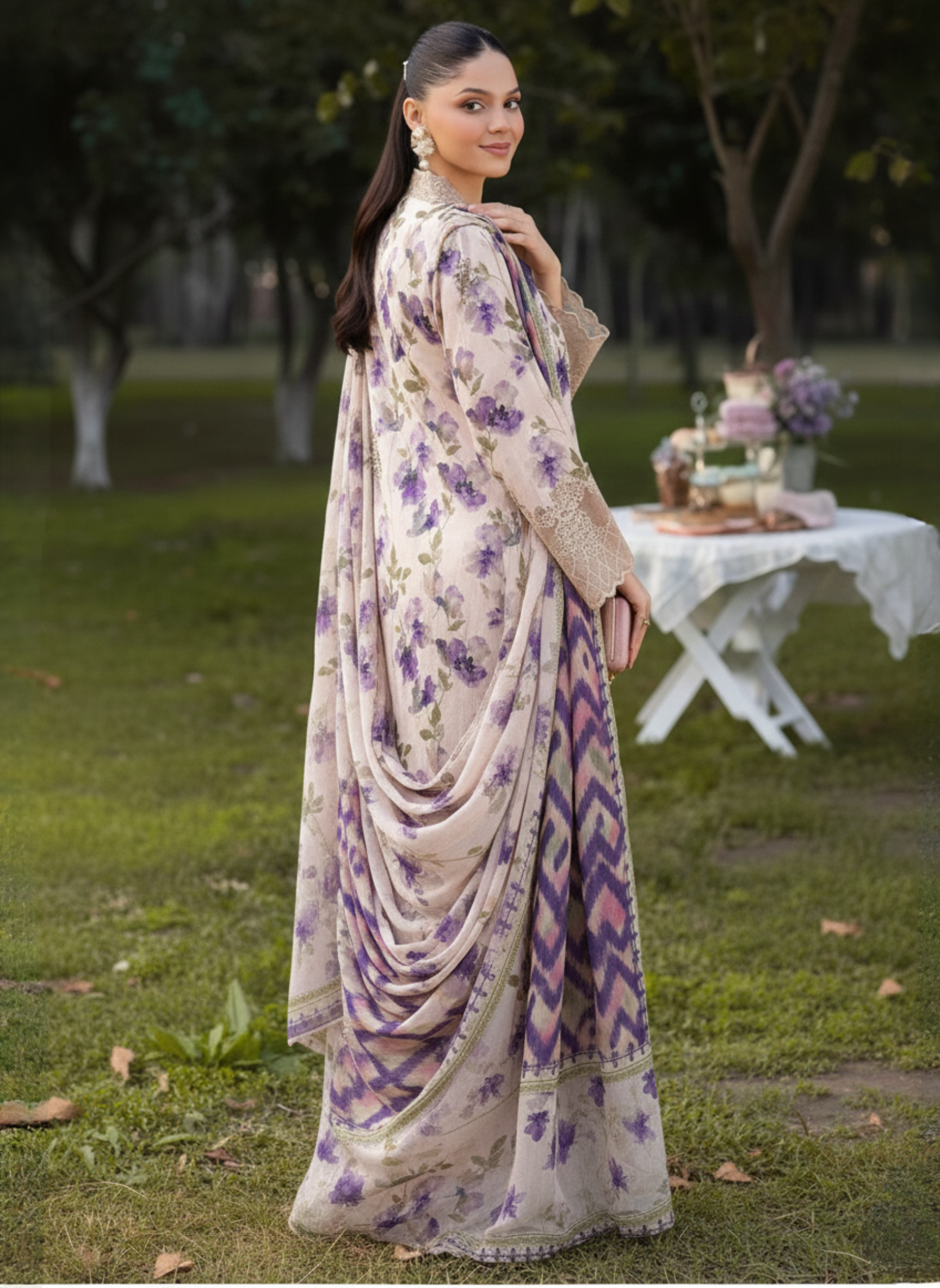 Soft tones meet artistic elegance in this Premium Embroidered Unstitched 3-Piece Lawn Suit, thoughtfully designed for women who value comfort with refined style. Set on a soothing beige base, the shirt is enhanced with graceful purple floral prints that bring freshness and visual harmony to the overall look.