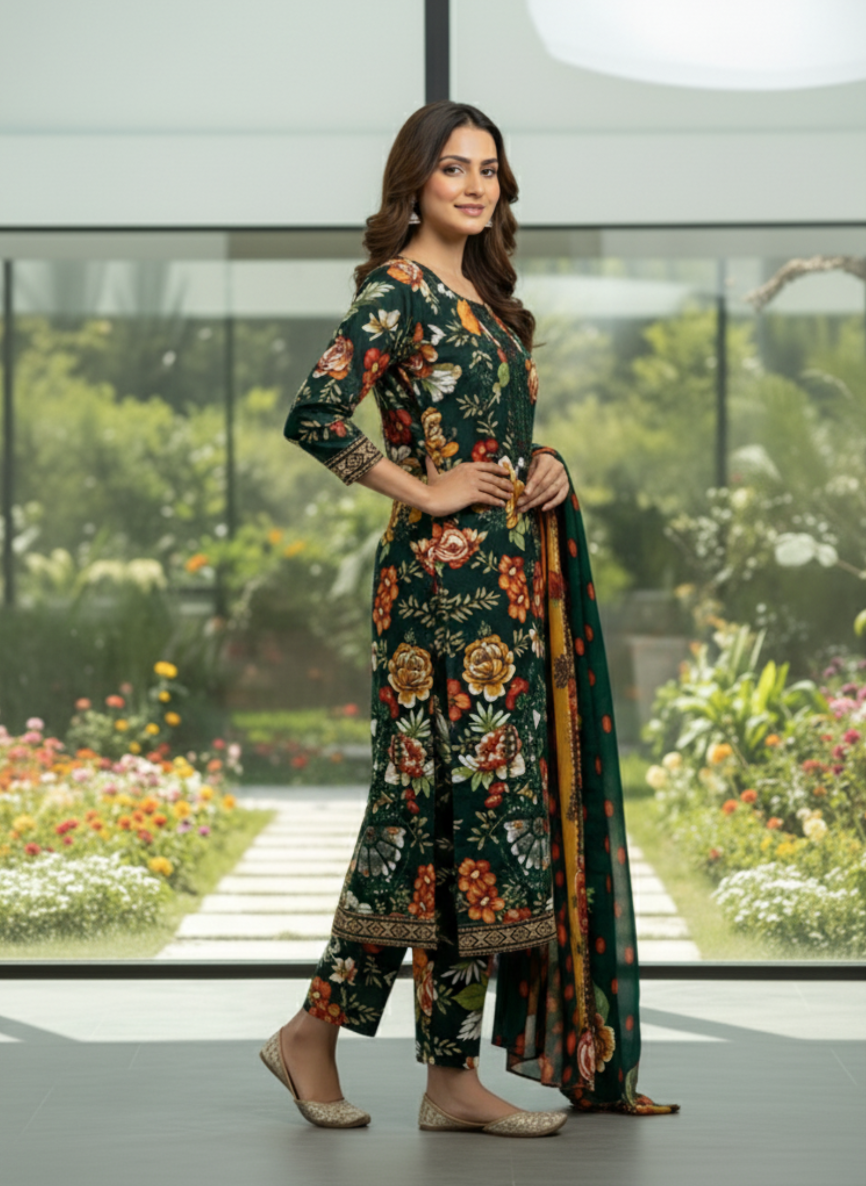 The kameez features rich floral prints enhanced with refined embroidery that elevates the overall look without overpowering it. Paired with coordinated printed lawn trousers and a lightweight printed lawn dupatta, the suit offers a graceful flow and a polished finish. Ideal for daily wear, casual meet-ups, or relaxed daytime styling, this ensemble reflects quality craftsmanship with a soft luxury feel.